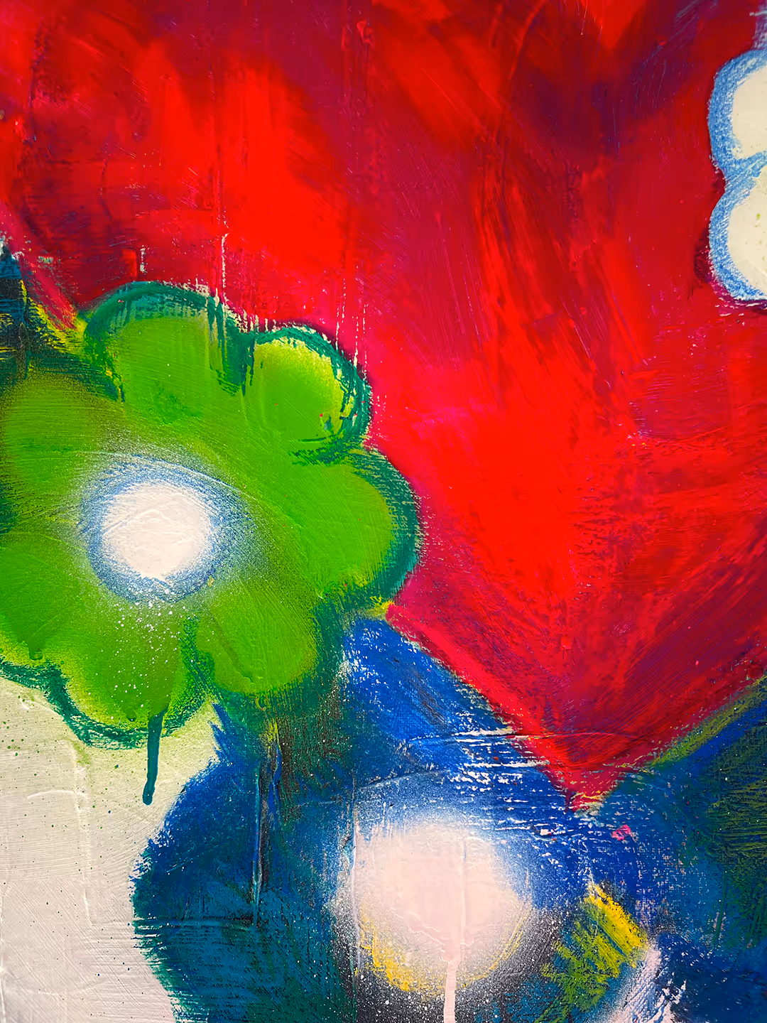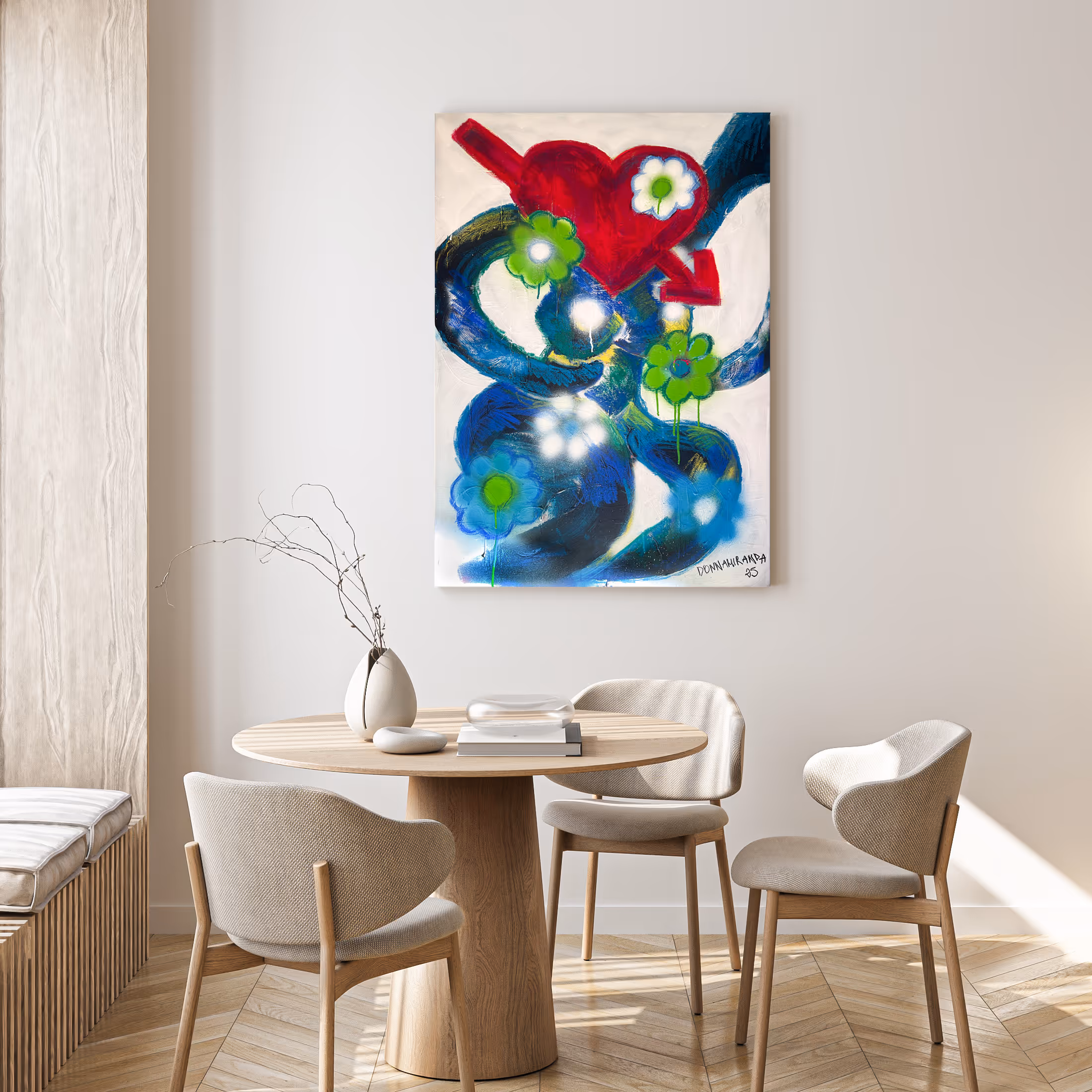 Il quadro “Bouquet of flowers” presenta dei fiori disposti liberamente che sembrano fluttuare attorno al cuore centrale. L’opera suggerisce visivamente il dono e la leggerezza di un mazzo di fiori, attraverso volumi morbidi e colori accesi che richiamano freschezza, vitalità e un senso di euforia.