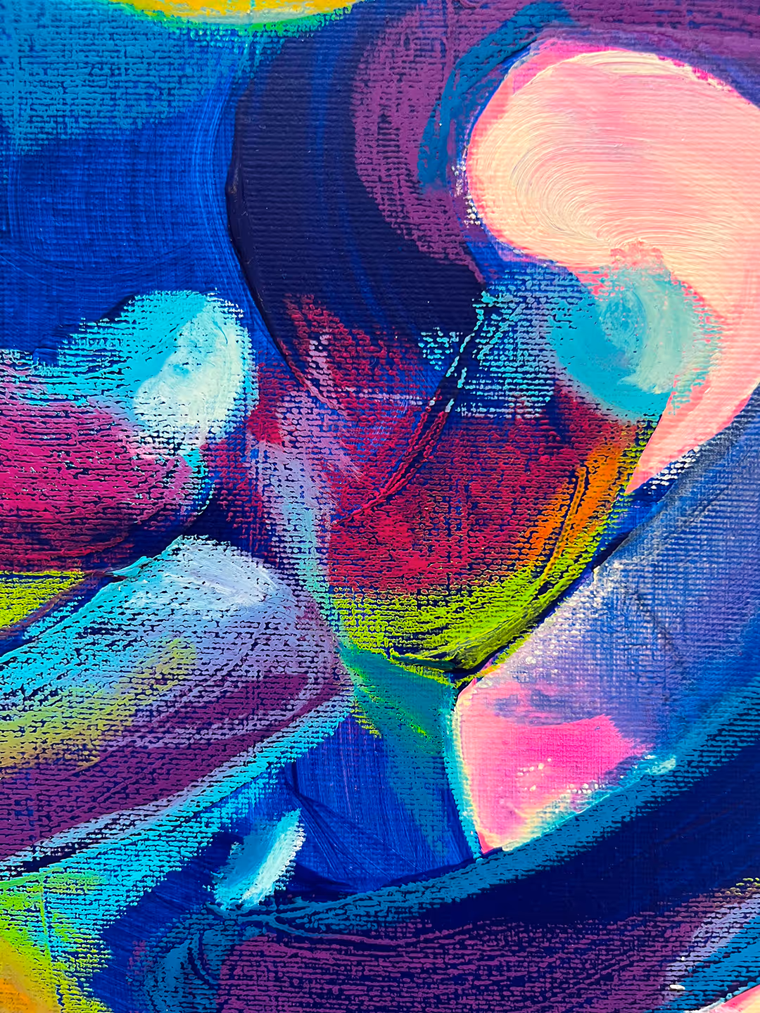 Un abbraccio fluido e potente prende forma attraverso colori vibranti. La figura femminile si espande nello spazio con forza e intimità, mostrando un gesto materno di cura. I colori opposti trasmettono gioia e felicità nel vivere quel momento.
