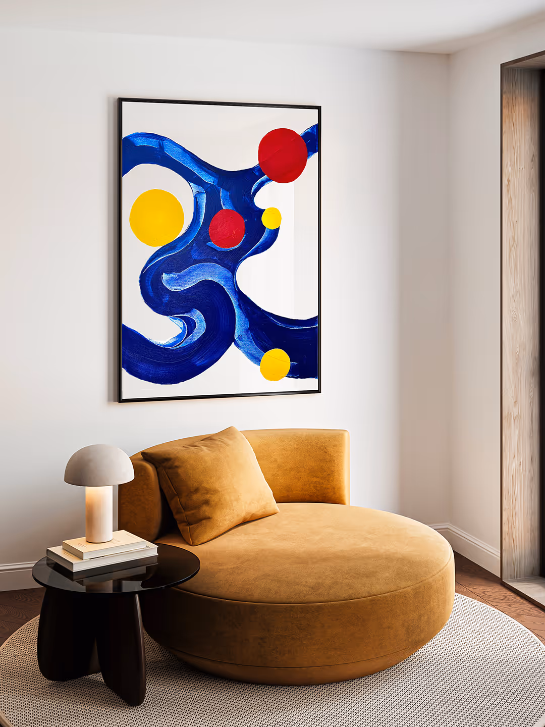 Il corpo si espande nello spazio in un movimento continuo, suggerendo forza e energia. L’uso dei colori primari restituisce la potenza fondamentale del gesto, rendendo il movimento universale. La figura in corsa trasmette dinamismo e vitalità.
