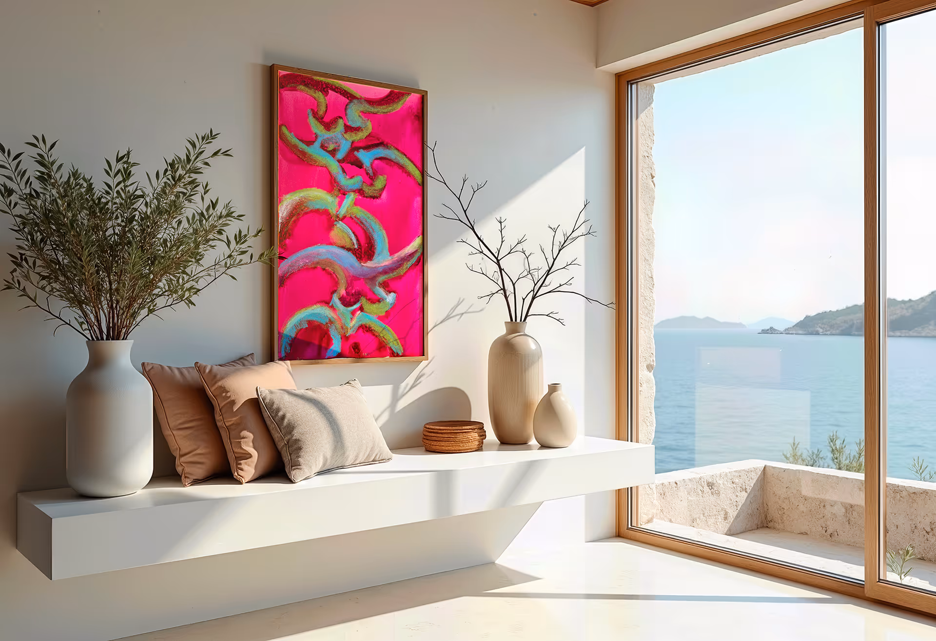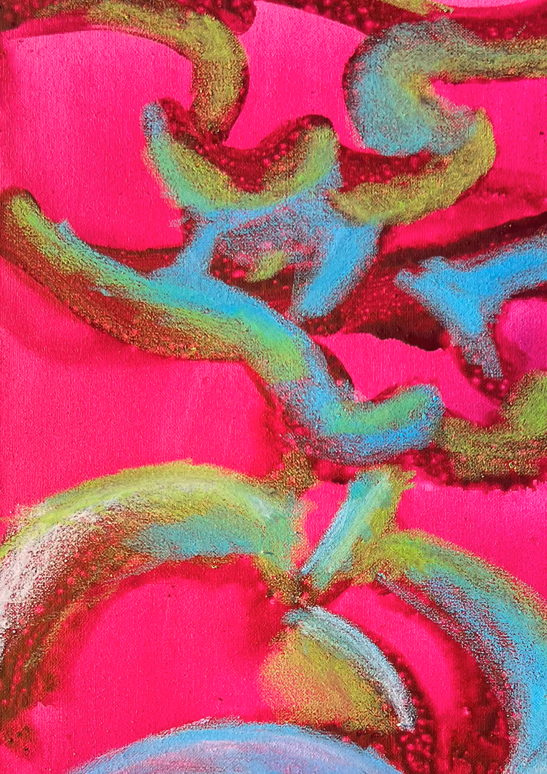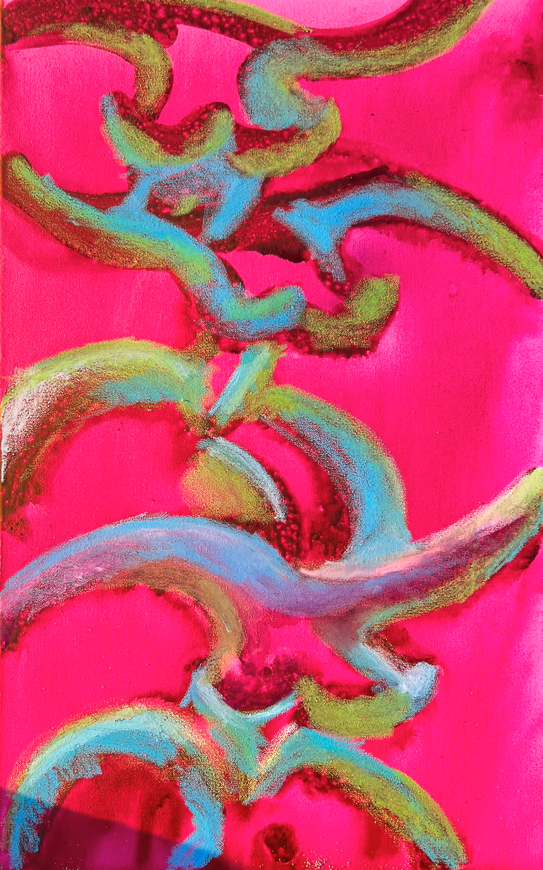 Pennellate fluide attraversano uno sfondo fucsia intenso, trasformando il colore in pura energia visiva. Il ritmo del movimento crea intrecci di segni, nati dal contatto diretto con il mare e la sabbia. La salsedine e l’acqua marina mescolate ai colori danno origine all’opera.